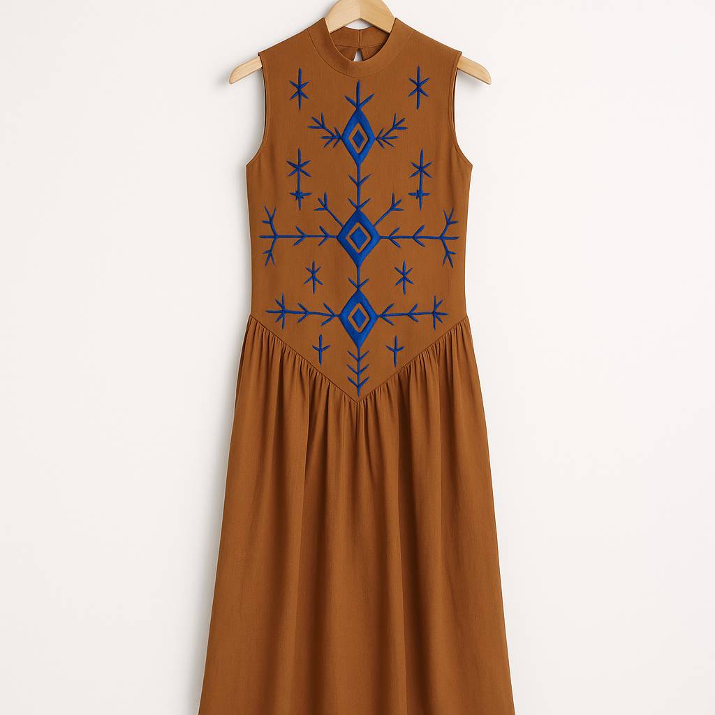 Exude regal elegance in this Sleeveless Long Dress with Blue Embroidery, a masterpiece that fuses timeless Ethiopian craftsmanship with a queenly modern allure. Flowing to a graceful length, the dress is adorned with intricate, hand-stitched blue embroidery reminiscent of royal Ethiopian motifs. Its luxurious detailing and sophisticated silhouette make you feel every bit the modern-day queen.