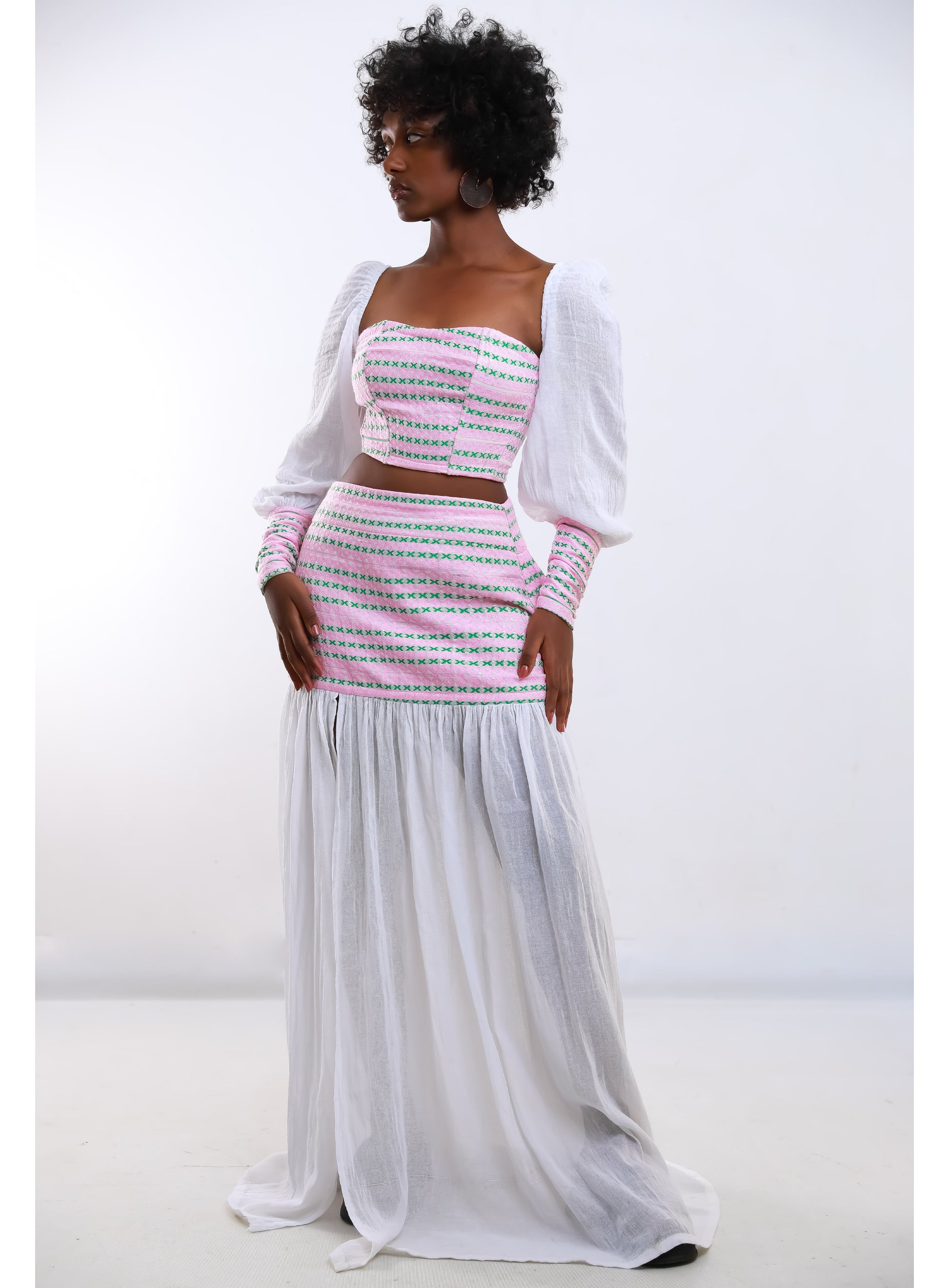 Handwoven Habesha Tibeb Top and Skirt Ensemble in Menen Fabric with Pink Tibeb Design