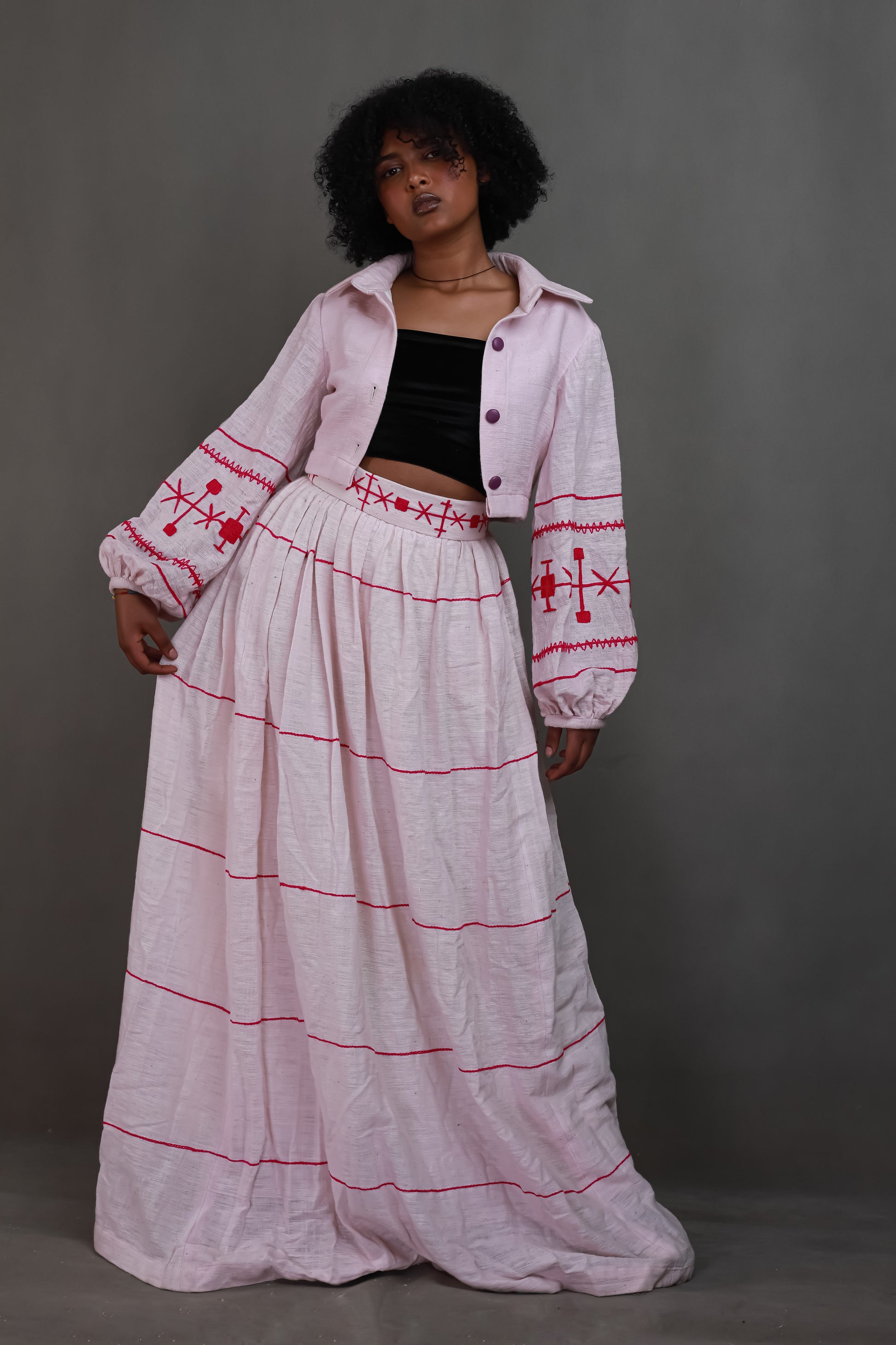 Purple Design Embroidery Handwoven Habesha CropTop and Skirt, Modern Ethiopian Dress