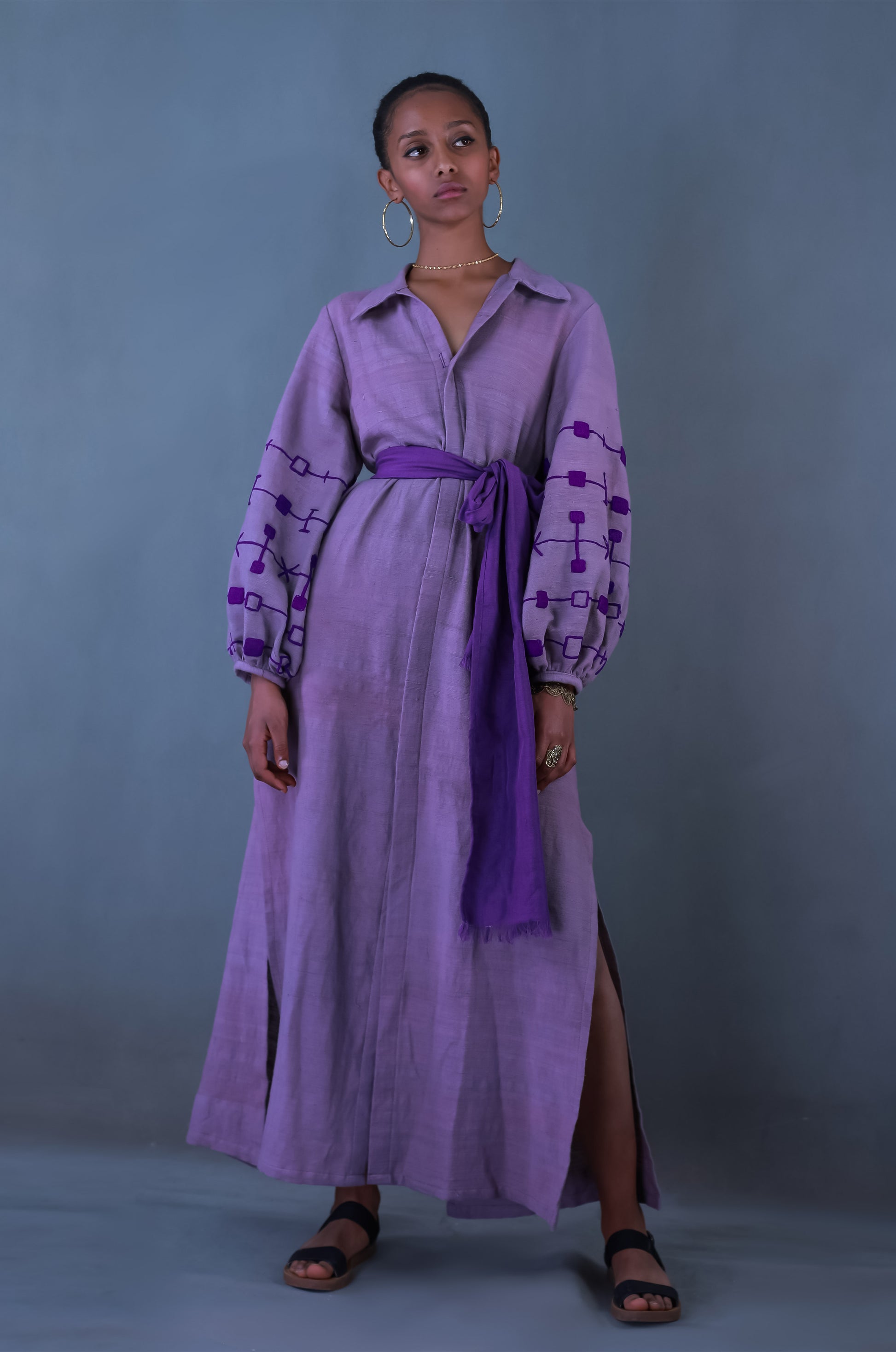 Embrace a unique fusion of styles with our Kimono Purple Dress with Embroidery. This exquisite dress blends the elegance of traditional Ethiopian craftsmanship with the graceful silhouette of a kimono, making it a perfect choice for any special occasion or cultural event.