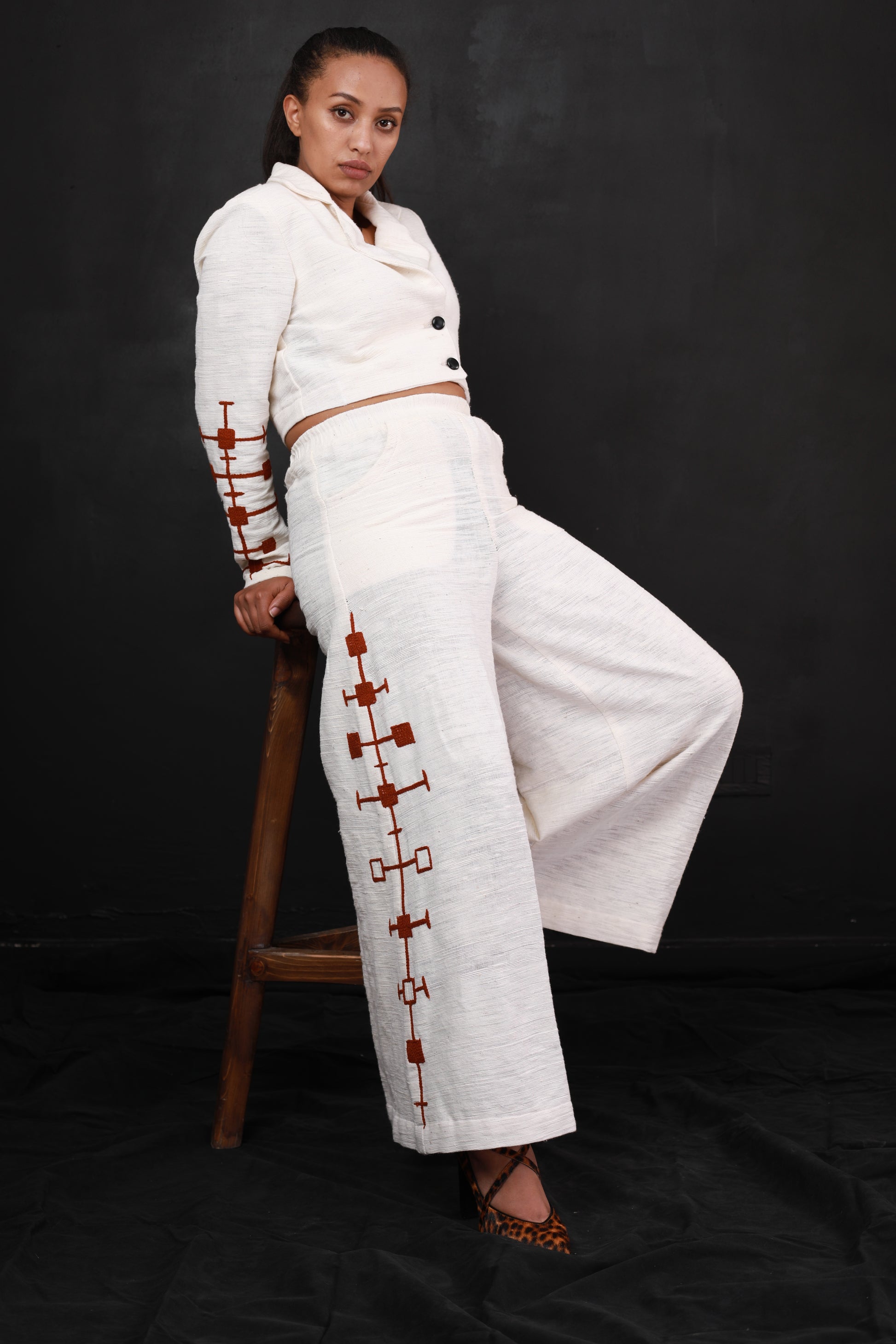 Embracing Heritage in Style: This exquisite Habesha dress seamlessly blends traditional Ethiopian design elements with a modern fashion sensibility, embodying the essence of Habesha libs and Ethiopian dress. The white base of the dress beautifully contrasts with intricate brown cross-stitch patterns, meticulously adorning the sleeves, waist, and pants. With its high neckline and long sleeves, this dress exudes elegance, offering a perfect fusion of Habesha kemis and contemporary trends. Ideal for those who cherish the richness of Habesha culture and aspire to make a bold fashion statement.