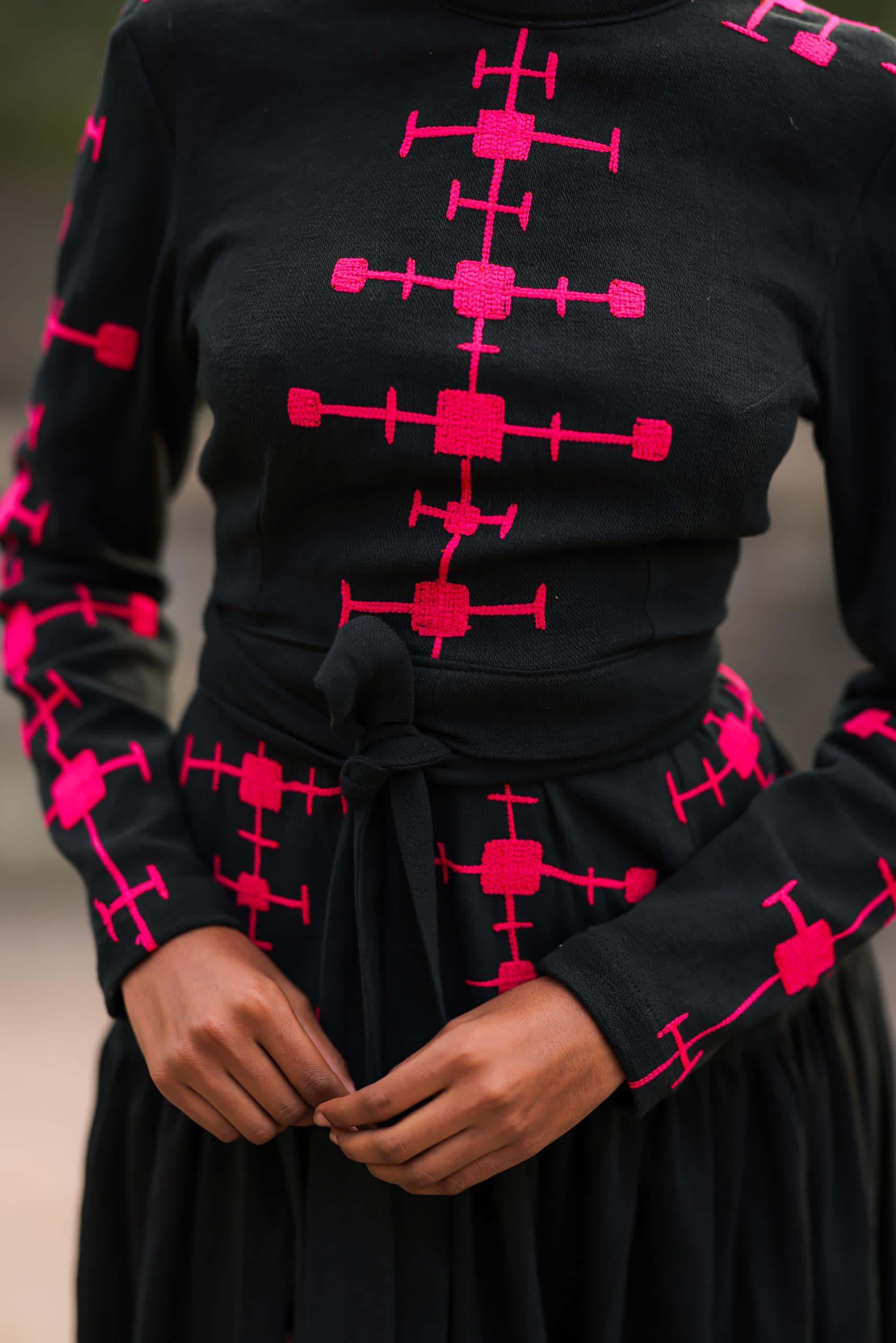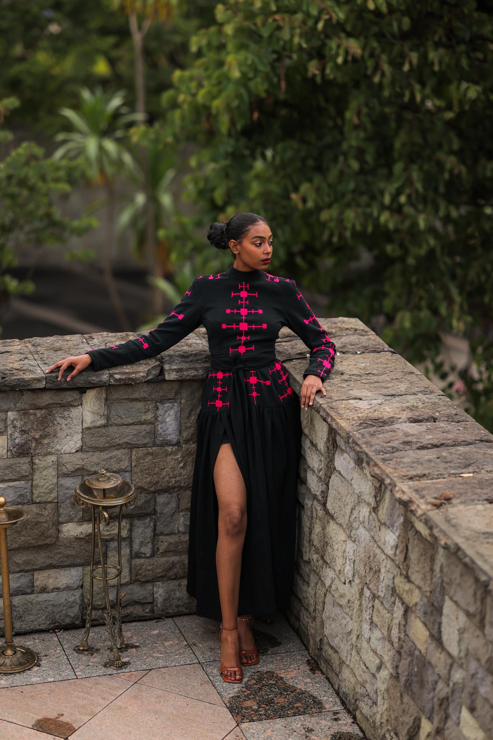 Modern Ethiopian Two-Piece Set – Skirt & Tie-Up Top with Black and Hot Pink Embroidery