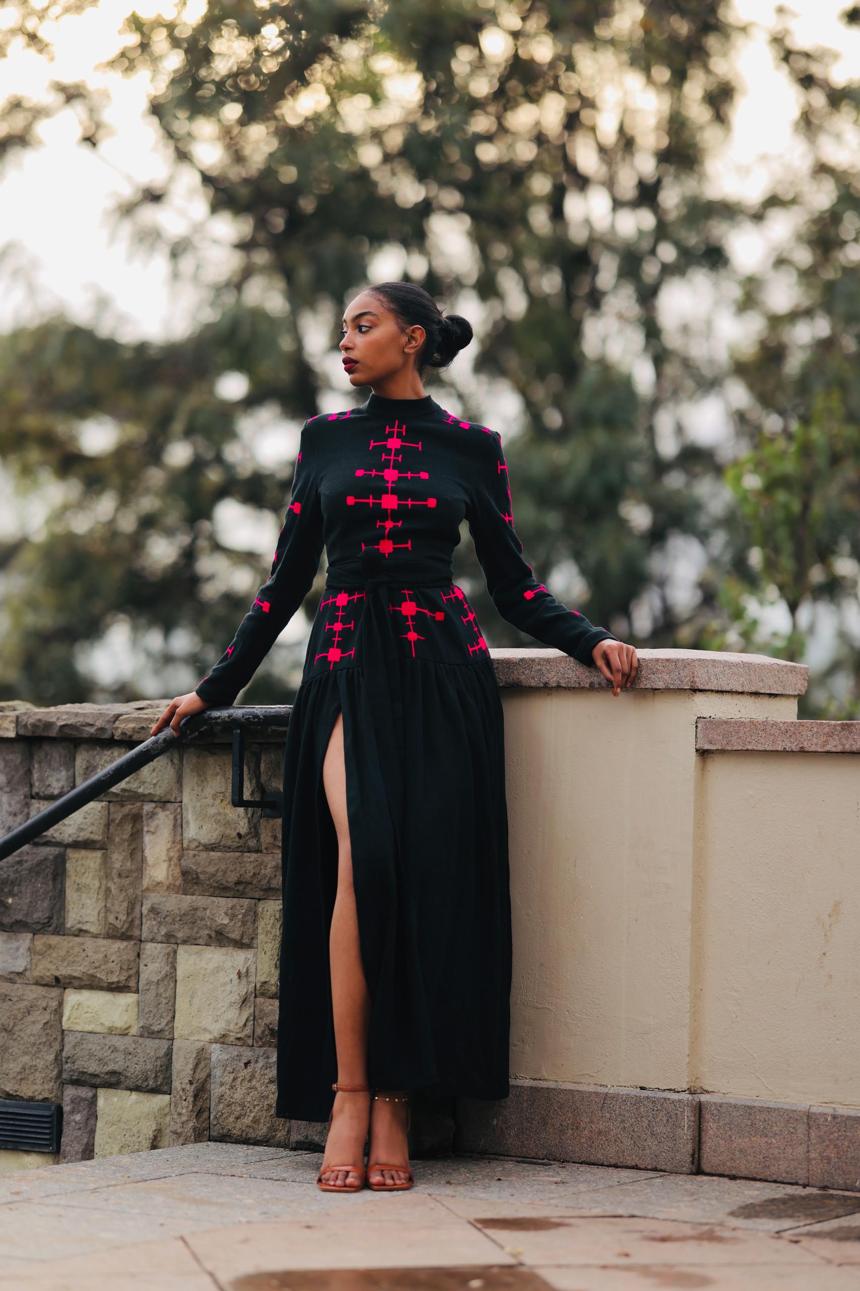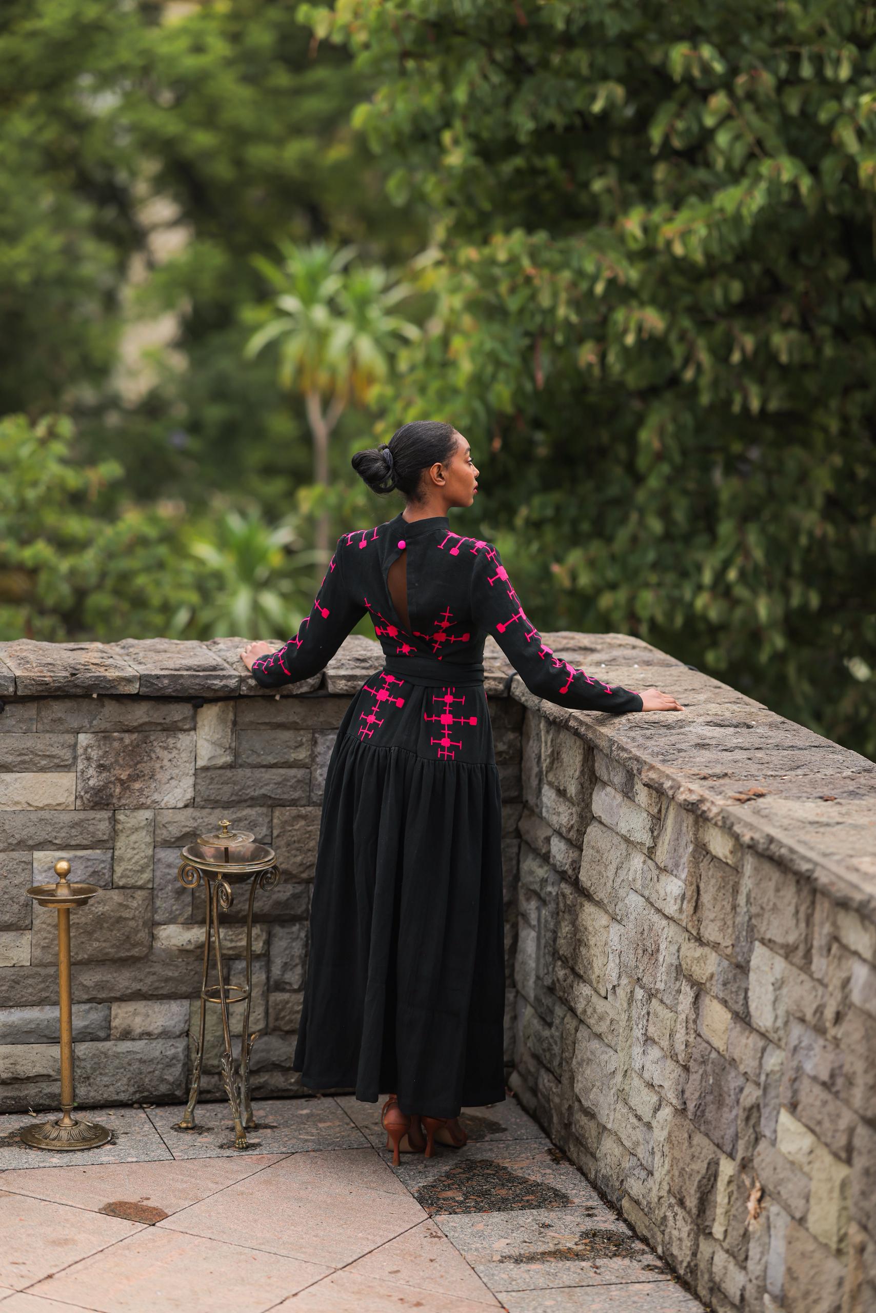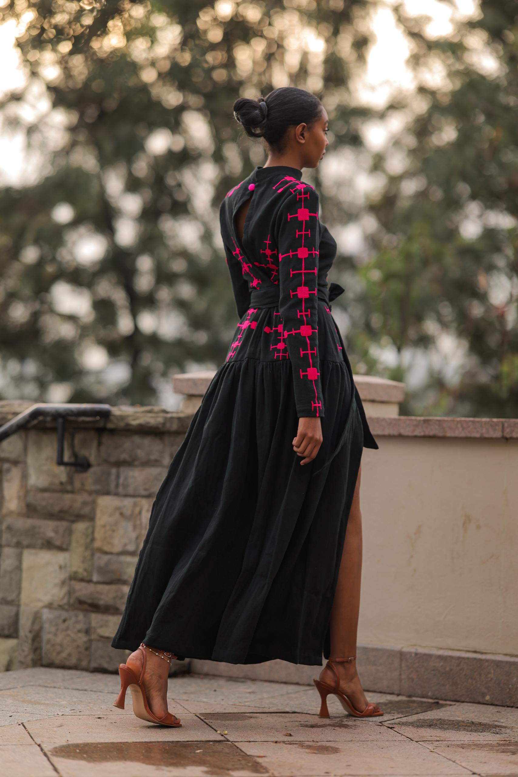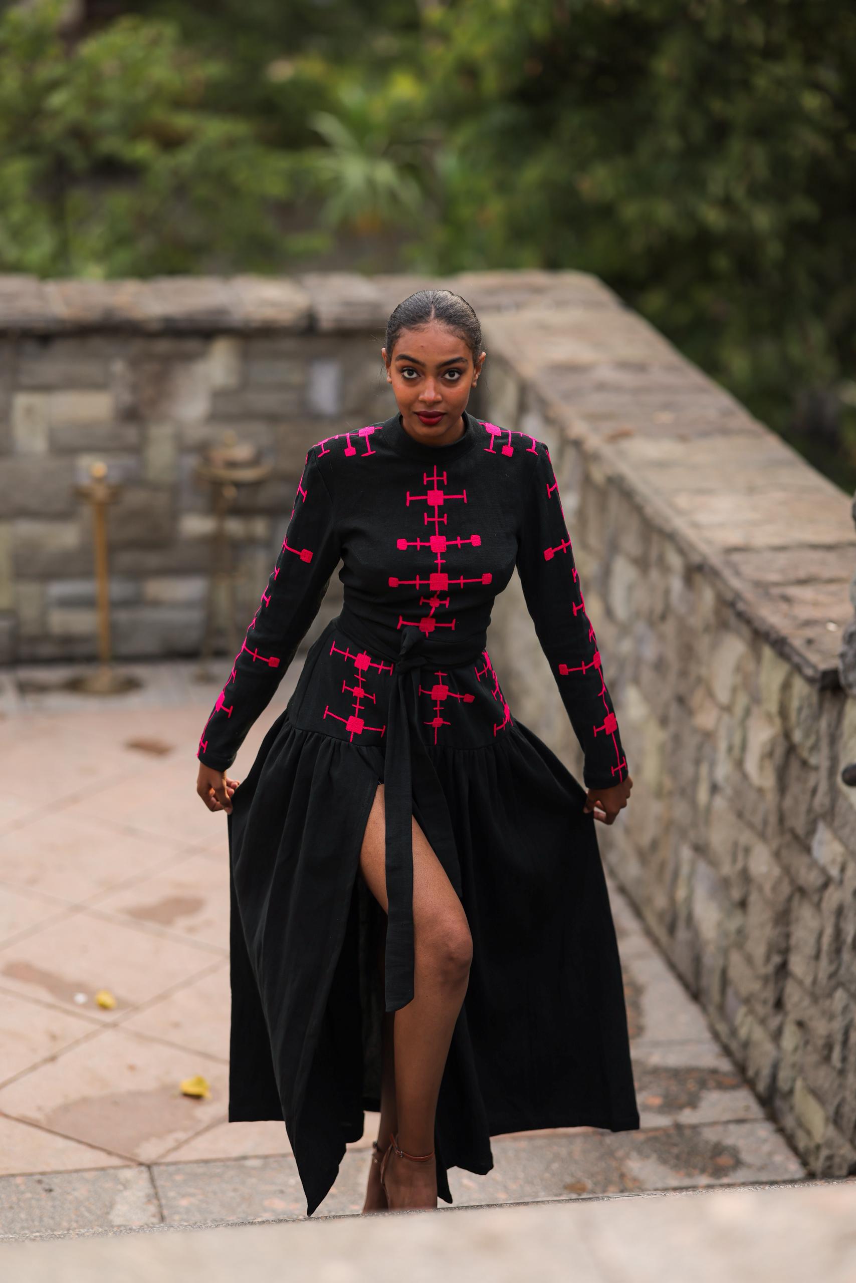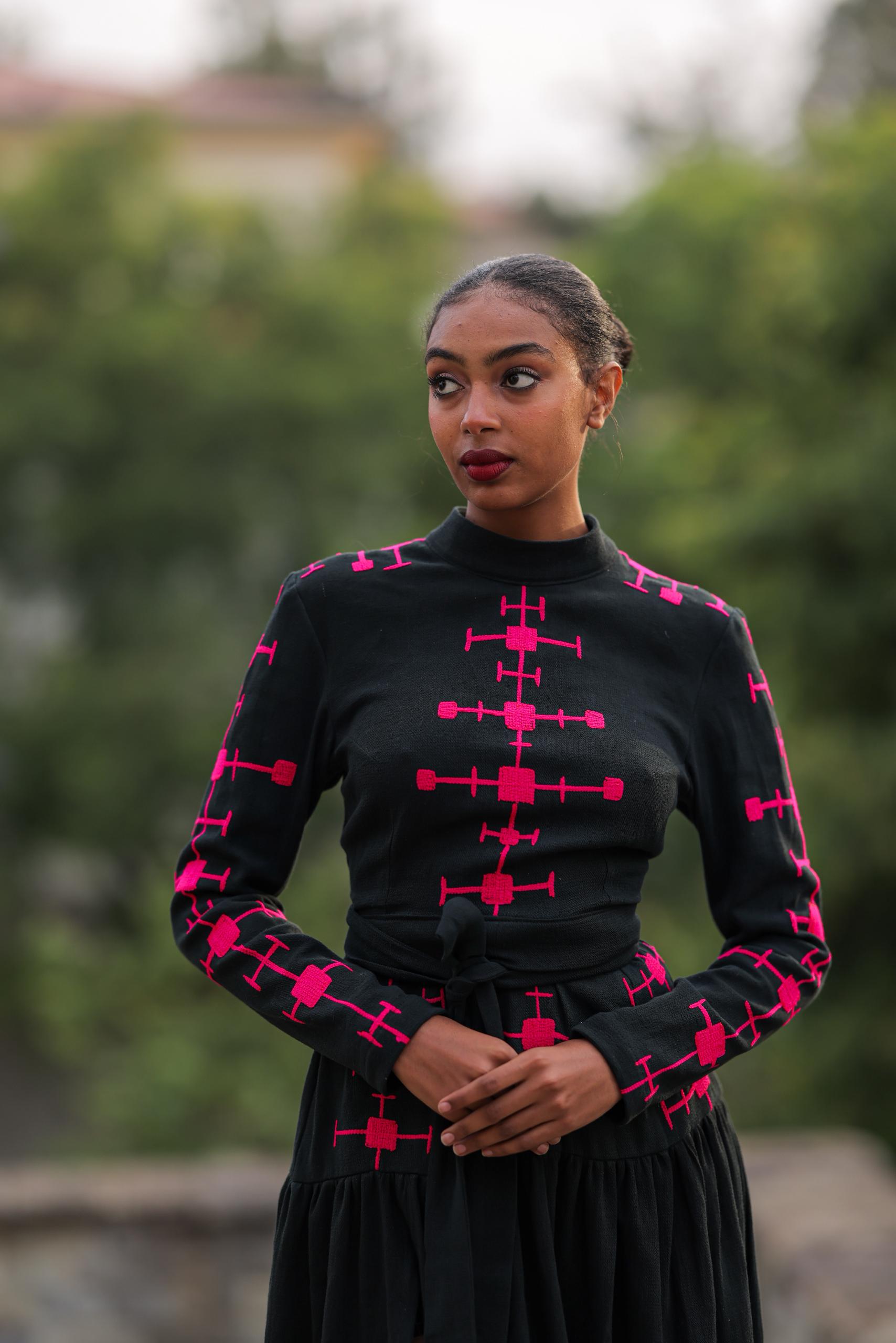 Signature Ethiopian Embroidery: Eye-catching hot pink and black embroidery adds bold contrast and cultural richness.