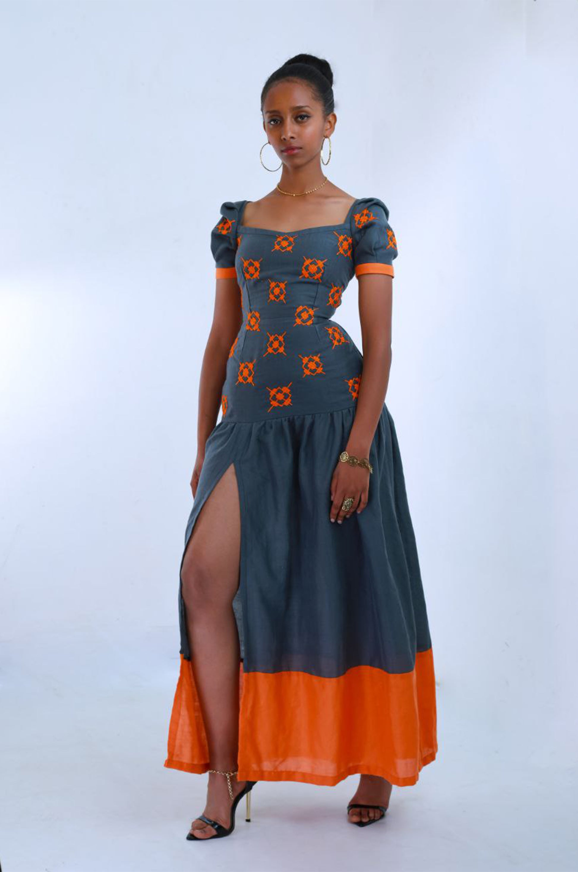 - Striking Orange Embroidery: The dress features beautiful orange embroidery, highlighting the intricate artistry and cultural richness of Ethiopian design.