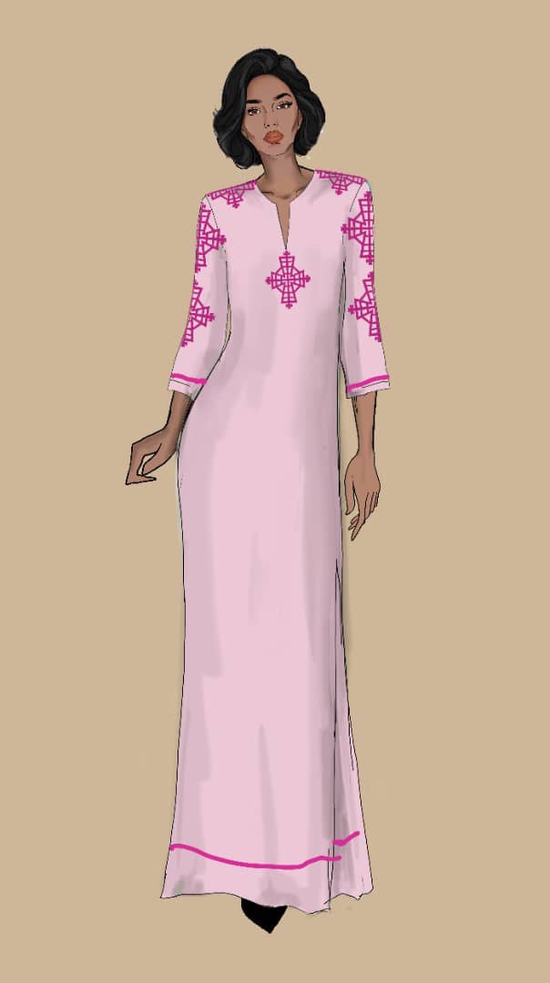 Celebrate the beauty of Ethiopian tradition with a modern glow in this Pink Long Cultural Dress, adorned with delicate embroidery and sparkling stone embellishments. Designed for the contemporary woman who embraces heritage with style, this graceful Habesha dress combines timeless artistry with a refined silhouette—perfect for elegant dinners, cultural gatherings, or formal events.