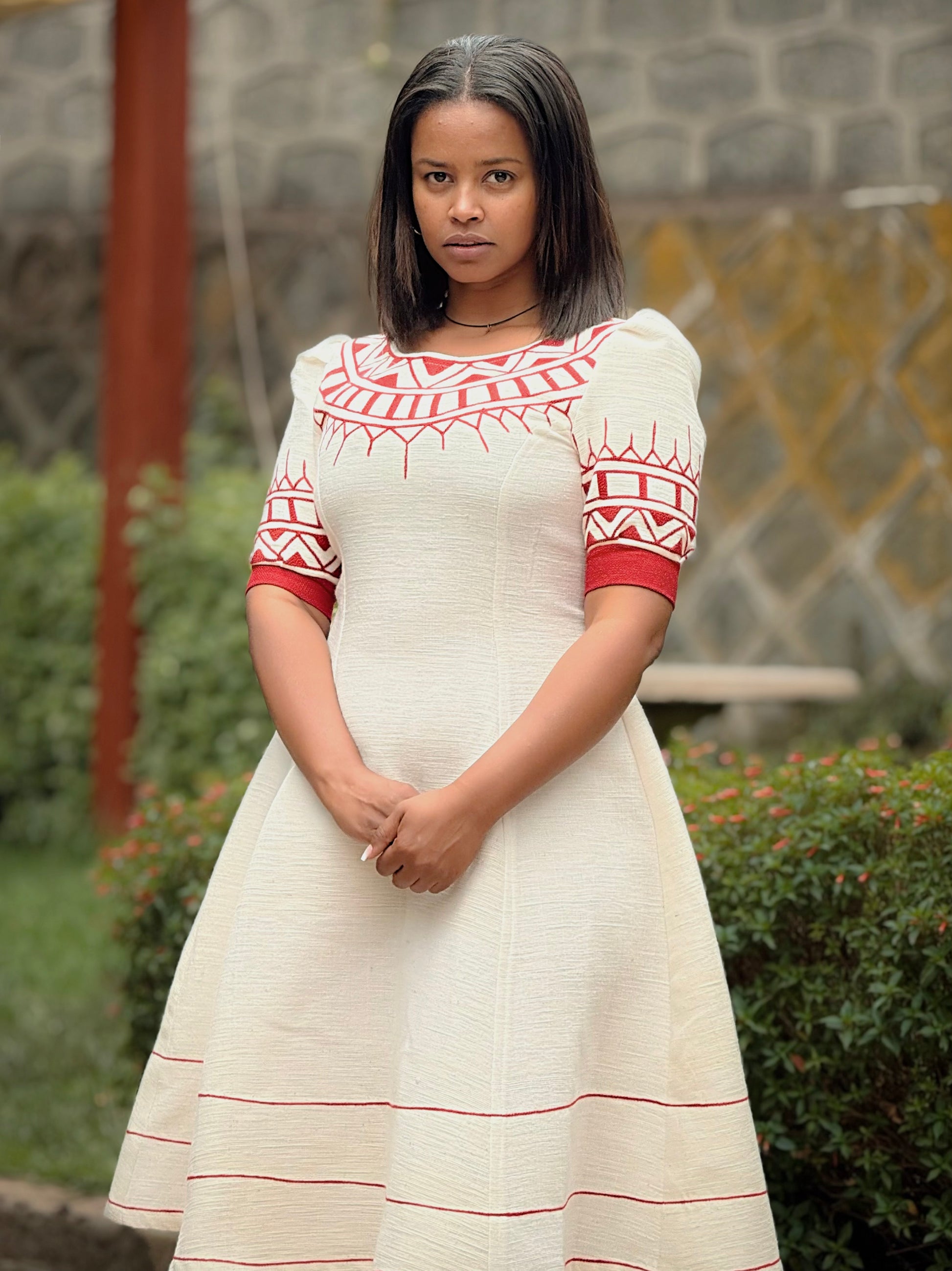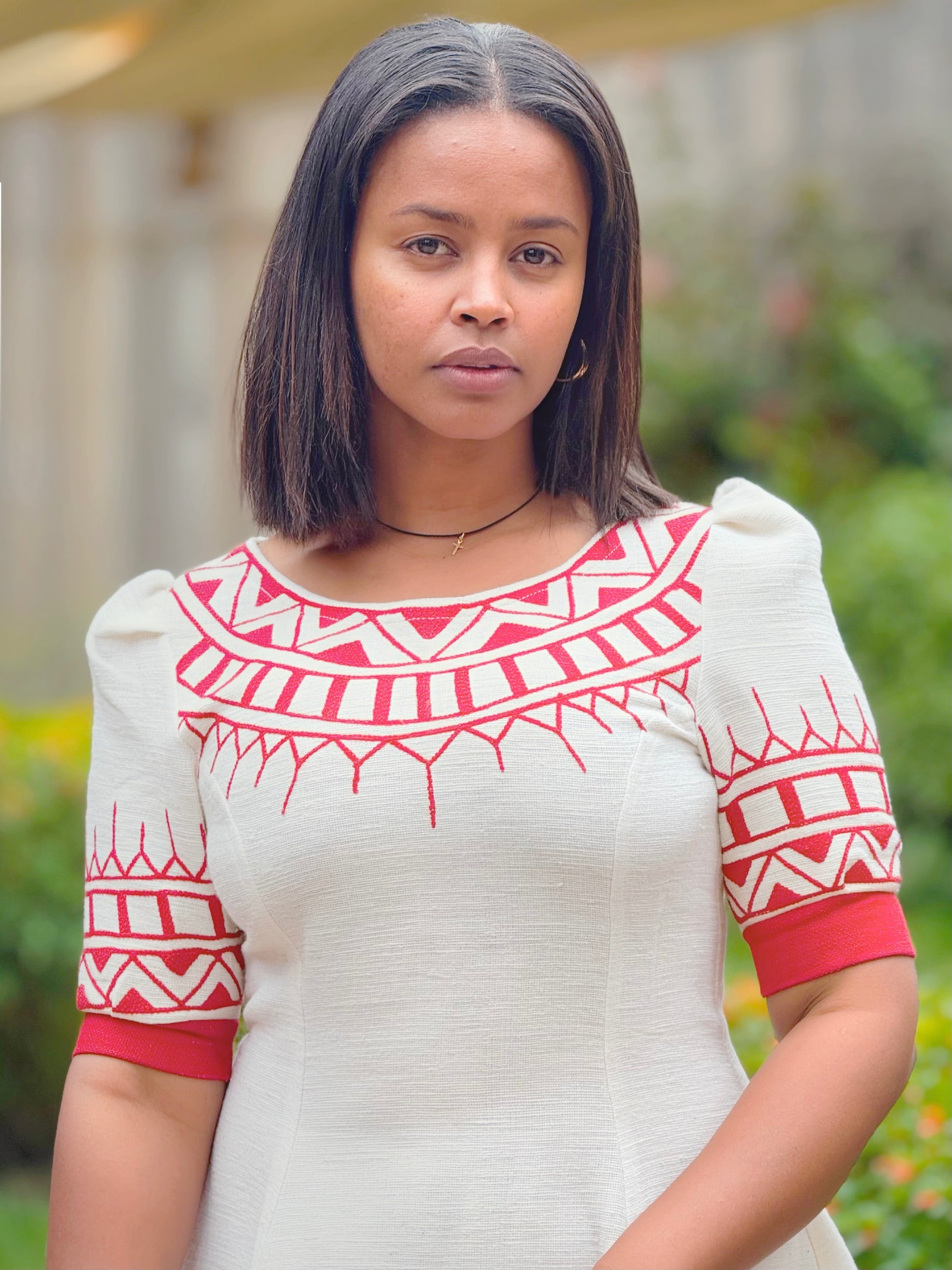 Crafted from crisp white Ethiopian fabric, the dress features intricately hand-embroidered red patterns that circle the neckline in a majestic design, reminiscent of ancient royal adornment. The bold red embroidery continues on the sleeves and hem, creating a vibrant contrast that symbolizes strength, celebration, and pride.